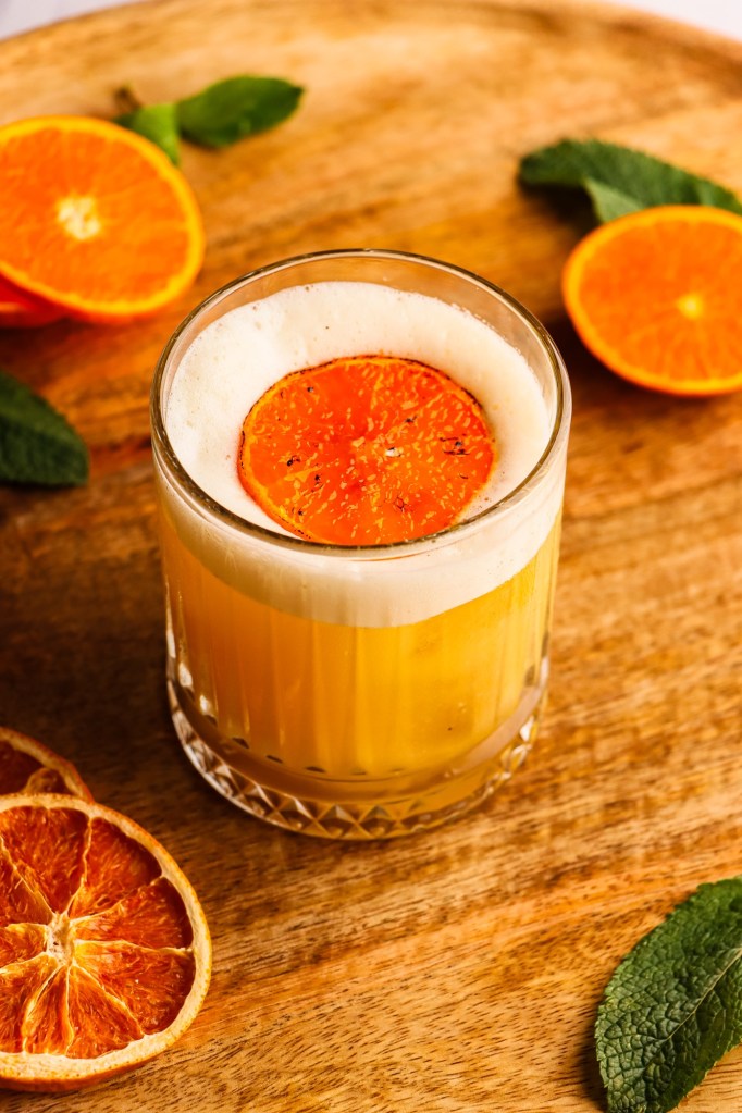 To make the brûléed orange garnish, top a thin orange slice with sugar, torch with a kitchen torch until the sugar is beautifully caramelised. Top your cocktail with the brûléed orange slice.