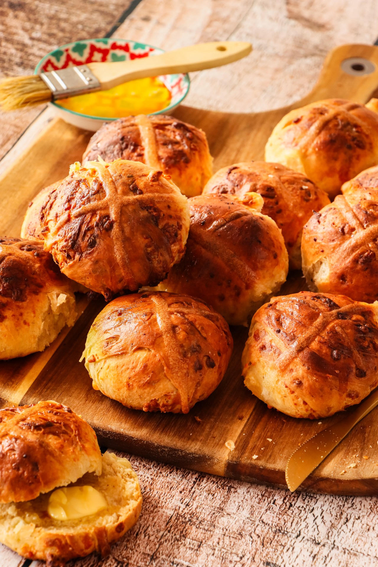 Once risen, lightly brush the tops of the buns with milk, pipe til a thick paste is formed. Pipe a line across each row of buns to create crosses. Bake for 20-22 minutes until golden brown. Allow to cool completely, and serve warm with butter.