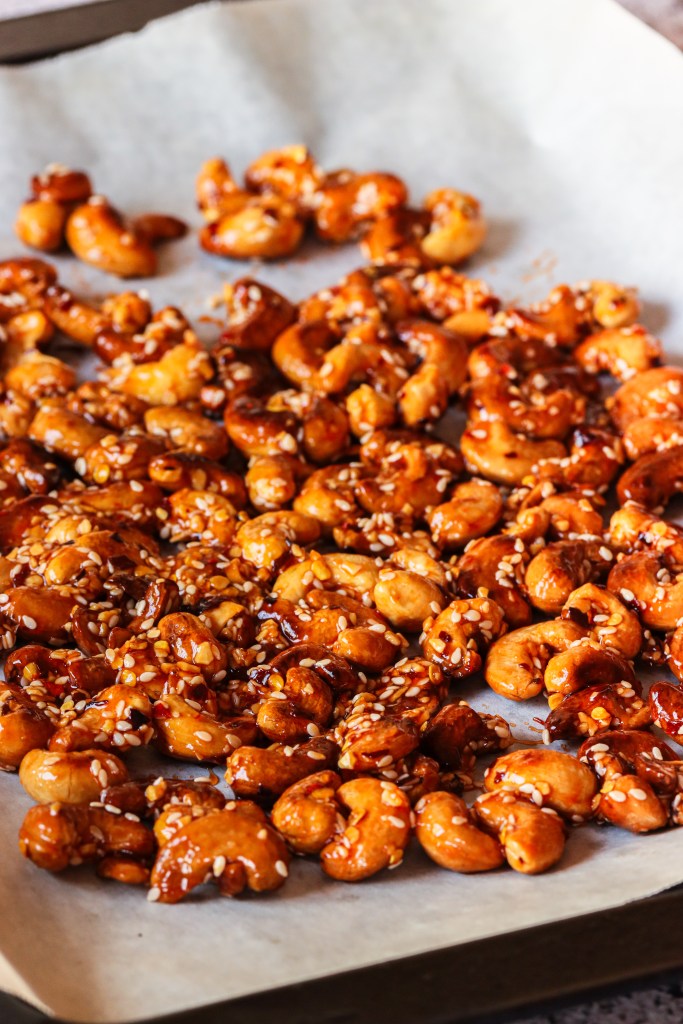 Return the cashew nuts to the baking tray and spread them into an even layer. Transfer the tray to the oven and roast for a further 12-15 minutes. Allow to cool before serving.