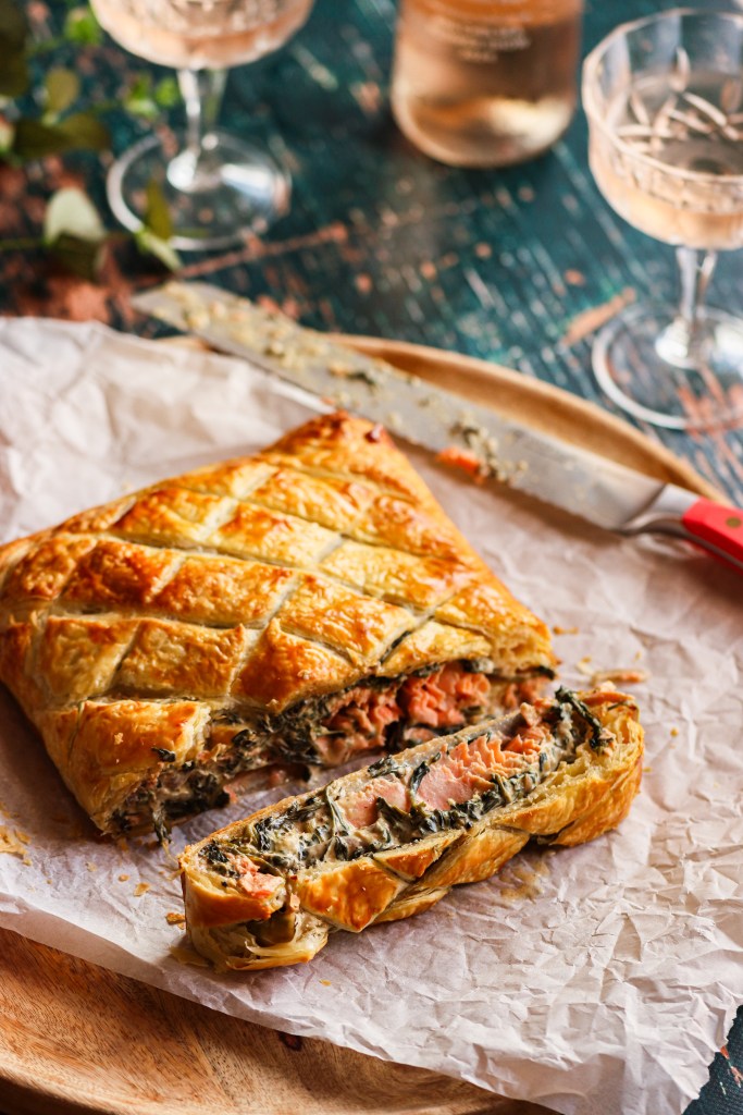 Unravel the puff pastry roll, place the salmon over the pastry, spread Dijon mustard over the salmon, and spoon the spinach mixture over the salmon. Lift the other half of the pastry over the salmon and gently press all edges. Use a fork to crimp the edges. Wrap the Wellington in cling wrap and refrigerate for 30 minutes.