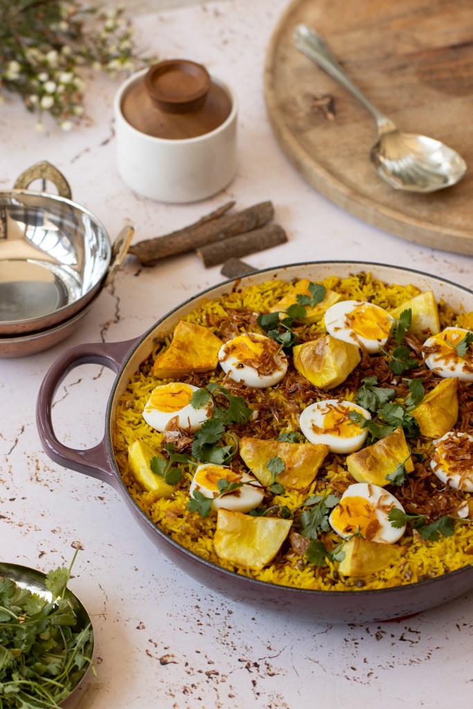 Preheat oven to 180°C. Remove the pot from the heat. Layer the rice and dhal mixture over the fish masala. Top with the crispy potatoes, boiled eggs, fried onions, and small cubes of ghee/butter.