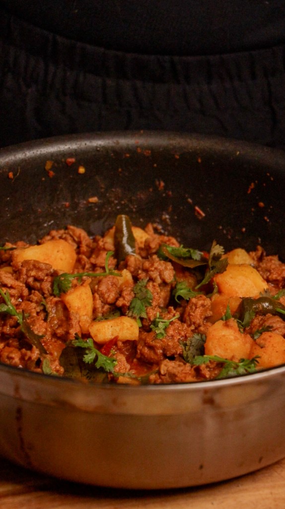 Cover and cook on medium-low heat until the mince is fully cooked and the potatoes are tender. Add a small splash of water if needed, but avoid making it watery.